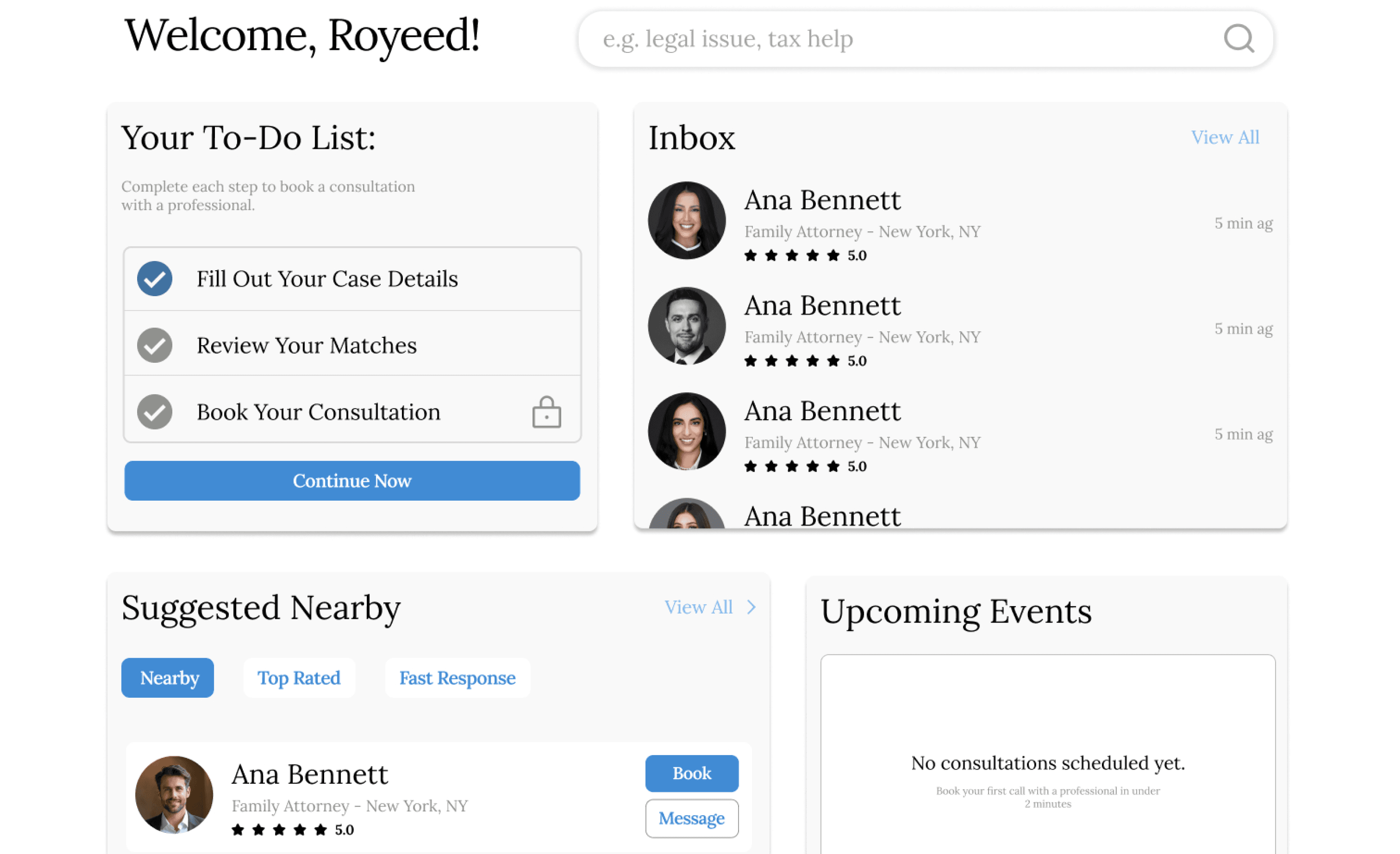 No central place to compare lawyers or advisors by specialty, availability, or fee structure. Booking is done via email or phone calls with multi-day delays.