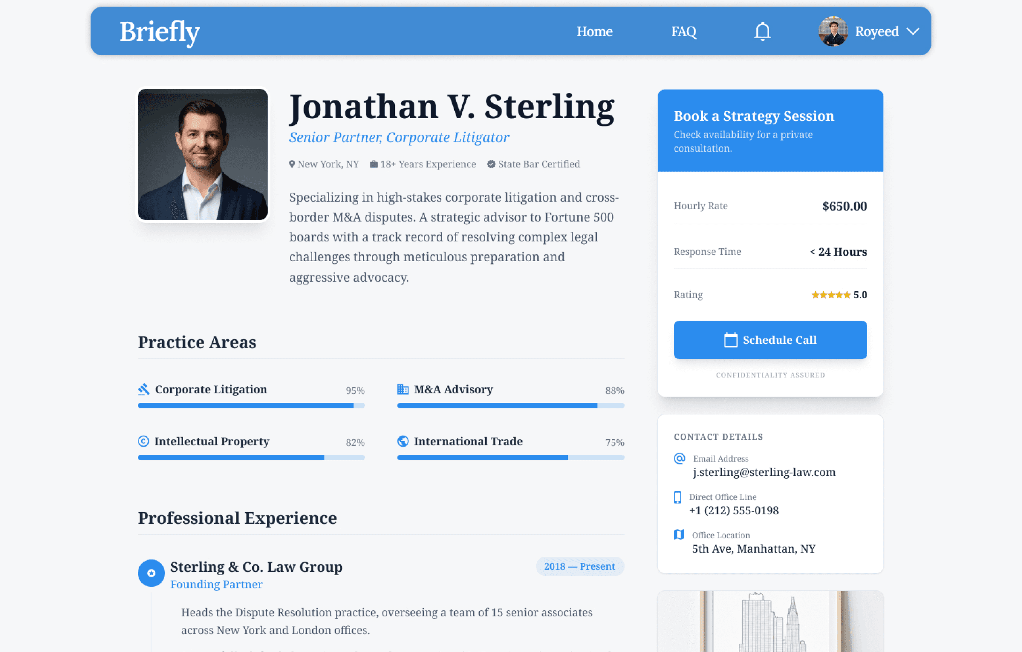 Finding a lawyer or financial advisor today is remarkably fragmented. People rely on outdated websites, word of mouth, and a lot of friction — there's no unified platform where you can compare professionals, see availability, and actually book an appointment.