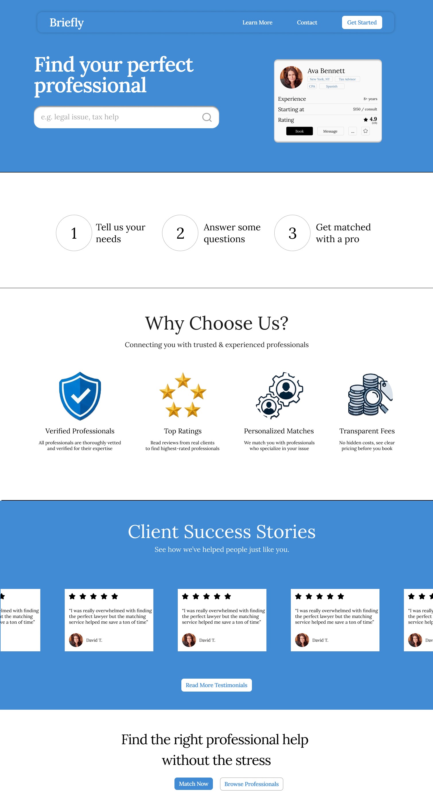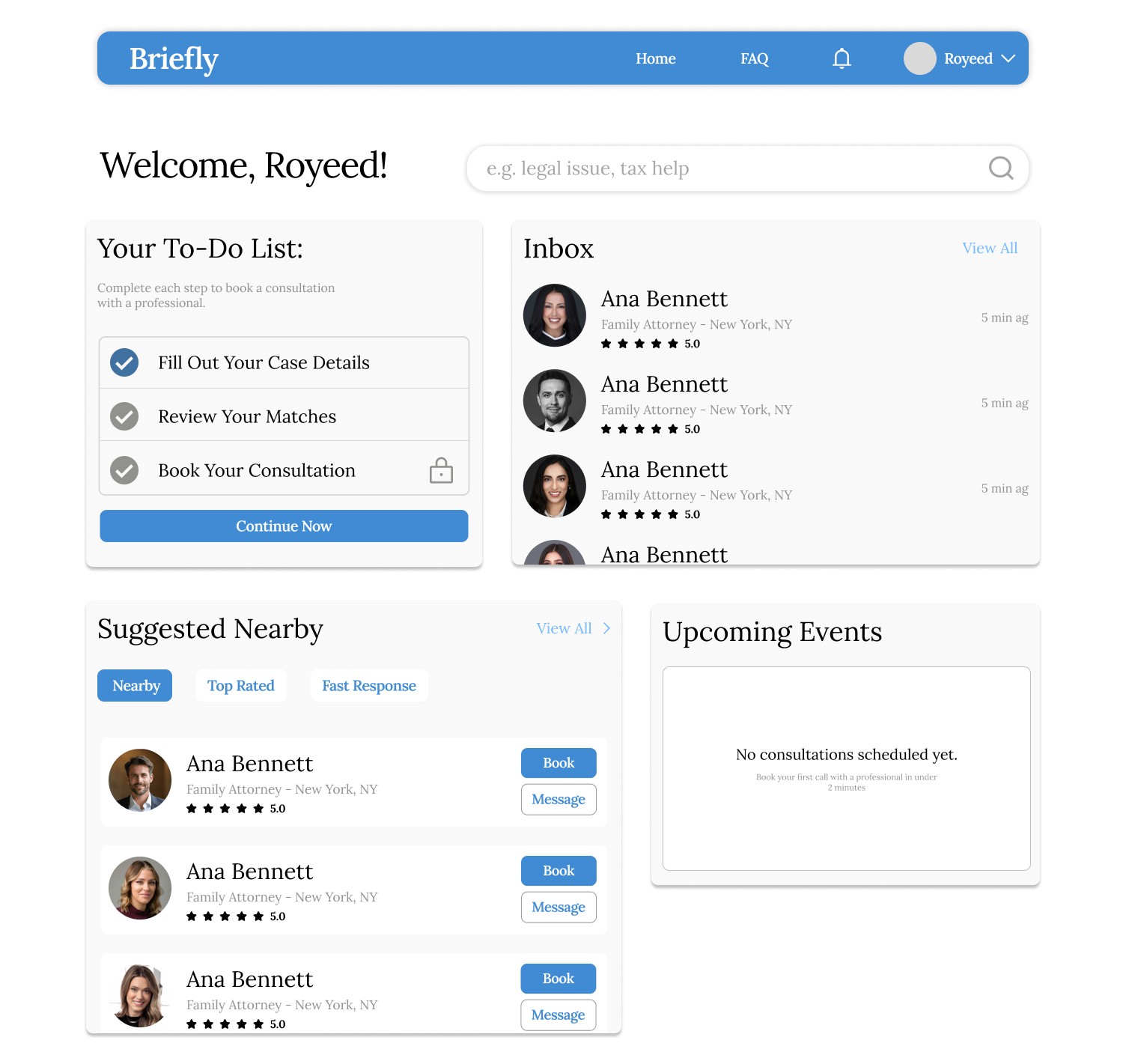 Designed an end-to-end mobile and web interface for Briefly, a centralized booking platform that enables users to discover, compare, and schedule appointments with legal and financial professionals through intuitive search filters, transparent profiles, and streamlined login and booking flows, improving both client experience and professional practice management.